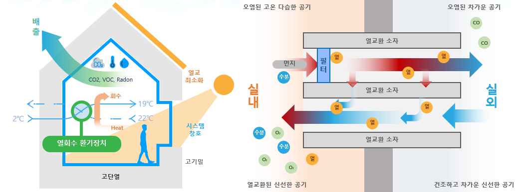 외부의 신선한 공기를 공급하면서 배출 공기의 열에너지를 회수해 실내 공기질 개선과 에너지 절감을 동시에 실현하는 환기장치입니다.